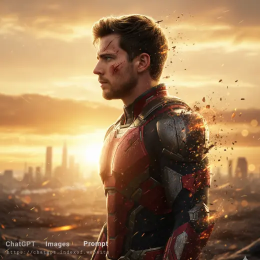 The "Heroic Sacrifice" prompt is a sophisticated exercise in "Pathos-driven" character design. Unlike standard superhero "power poses," this aesthetic focuses on the human cost of heroism—resilience, damage, and loss. By utilizing the "Disintegration Effect" (popularized in modern blockbusters), the prompt creates a narrative of a character fading away at their moment of victory. The use of Golden Hour lighting is intentional here, as the sunset serves as a visual metaphor for the "end" of a journey, providing a warm, tragic glow that elevates the portrait from a simple action shot to a fine-art cinematic still.