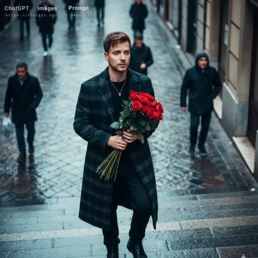 The "Rainy Urban Street" prompt is a masterclass in using color and perspective to evoke a specific emotional narrative. By employing a "high-angle perspective," the prompt places the viewer in an observant, almost protective position, looking down at a subject moving through a transition (the stone steps). This prompt utilizes the "Selective Color" technique—not through post-processing, but through natural composition—where the vibrant red of the roses serves as the emotional heart of an otherwise desaturated, cool-toned world. It perfectly captures the "European Cinema" aesthetic, blending melancholy with a spark of hope.