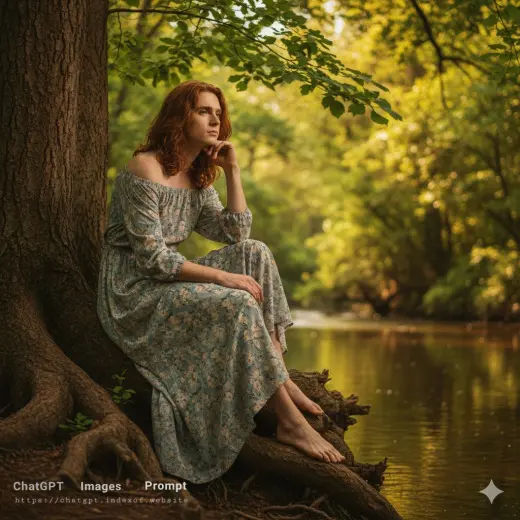 The "Golden Hour Riverbank" prompt is an exquisite example of "Soft-Focus" storytelling, where the environment is used to frame and soften the human subject. By combining the organic, gnarled textures of ancient tree roots with the fluid, reflective surface of a river, the prompt creates a high-contrast relationship between strength and tranquility. This aesthetic draws heavily from Pre-Raphaelite art and modern "Cottagecore" trends, utilizing specific technical metadata like the 85mm lens to achieve a professional, creamy background blur that is the hallmark of high-end portraiture.