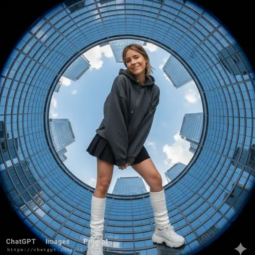 The "Fisheye Urban" prompt is a masterclass in "Dynamic Distortion"—a technique used to create high-energy, immersive visuals that break the standard rules of portraiture. By placing the camera on the ground looking straight up (Nadir perspective), the prompt uses the surrounding architecture as a natural "circular frame" for the subject. This aesthetic is a staple in Y2K-inspired fashion and modern streetwear editorials, as it exaggerates the size of footwear while making the subject appear larger-than-life. It is designed to challenge an AI's ability to handle extreme geometric curving and complex lighting from a vertical orientation.