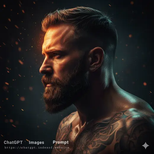 The "Fiery Hero" prompt is a masterclass in "Teal and Orange" color theory, a staple of Hollywood blockbusters. This aesthetic relies on the extreme contrast between warm, energetic light (representing fire, passion, or danger) and cool, structural light (representing technology, coldness, or stability). By focusing on hyper-masculine features and adding "volumetric" elements like embers and dust, the prompt creates a high-stakes narrative without needing a background. It is designed to push the AI to its limits in rendering "Wet Skin" physics and "Subsurface Scattering," where light appears to penetrate and glow through the skin.