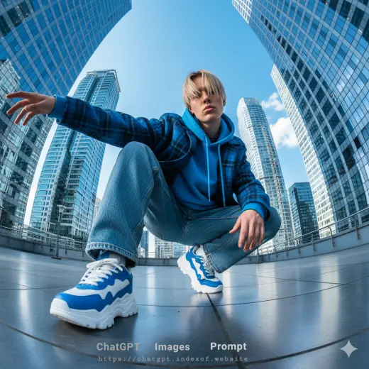 The "Urban Rooftop" prompt is a masterclass in dynamic fashion composition, specifically utilizing a "Low-Angle Wide-Angle" perspective to create a sense of scale and energy. By crouching the subject and extending their arm, the prompt creates leading lines that guide the eye through the frame, a technique commonly used in high-end streetwear lookbooks like those for Supreme or Hypebeast. This prompt leans heavily into "Monochromatic Styling," using various shades of blue to create a cohesive, clean, and modern aesthetic that stands out against the neutral tones of city glass and steel.