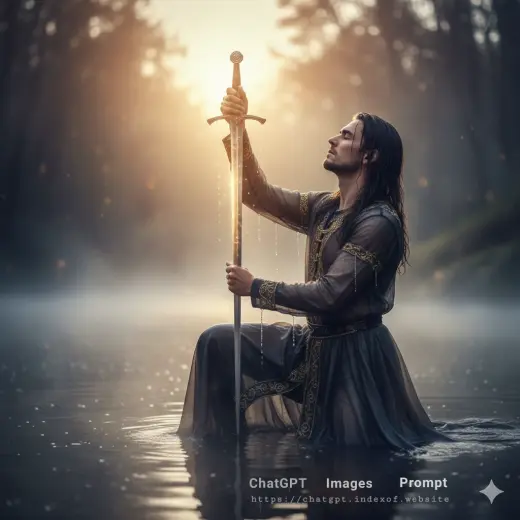 This cinematic visual captures a moment of spiritual awakening and ritual. By blending the weight of medieval weaponry with the softness of flowing gowns and misty river landscapes, the image evokes a sense of "High Fantasy" that is both intimate and epic.