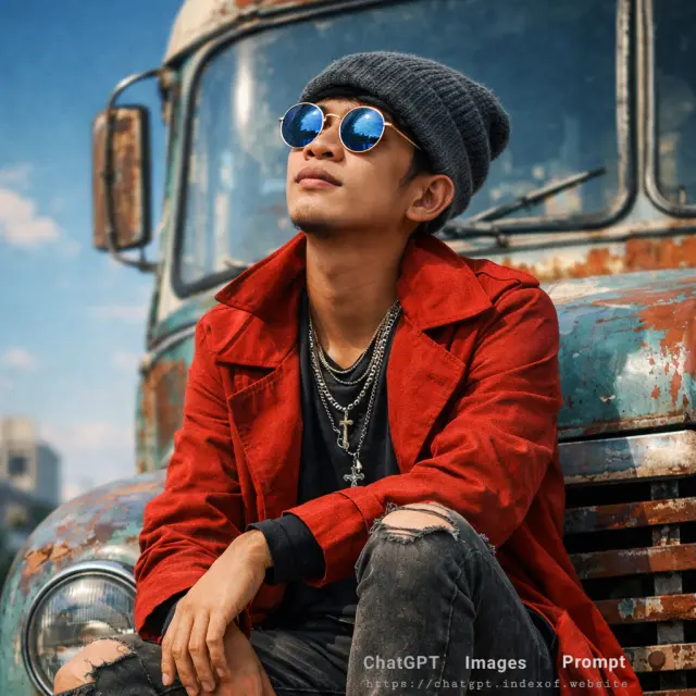 The "Vintage Bus Traveler" prompt is a sophisticated study in "Complementary Color Theory"—specifically the high-contrast relationship between the primary red of the trench coat and the turquoise/blue tones of the bus and sky. This aesthetic draws inspiration from 1970s road-trip cinema and modern high-fashion travel editorials found in magazines like Vogue or Vanity Fair. By placing a sharply dressed subject against a "weathered and peeling" vehicle, the prompt creates a "Gritty-Chic" narrative that emphasizes luxury within a rugged, authentic environment. It is designed to test an AI's ability to balance vibrant color saturation with realistic material decay.